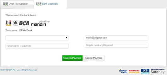 - Silakan klik Tab Over The Counter untuk pembayaran melalui INDOMARET. Isi kotak payer name dengan nama pembayar (tidak harus sama dengan pemilik ATM), isi email dan nomor HP.