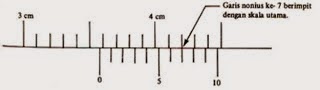 Cara membaca skala = skala utama sebelum 0 skala nonius + skala nonius yg berhimpit skala utama = 3,5 + 0,07 = 3,57 cm