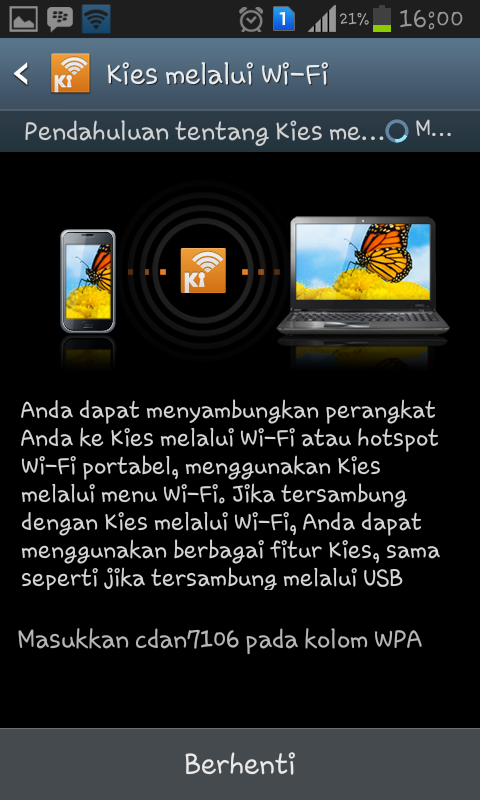 7. Jika disuruh memasukkan password saat melakukan koneksi, silahkan anda buka menu “Kies”, pada Smartphone yang anda jadikan WIFI
