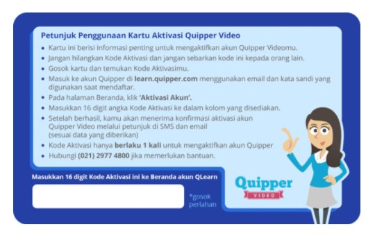 Langkah terakhir nih, kalian bisa aktifkan akun Quipper Video dengan memasukkan kode aktivasi yang ada di dalam kartu dan mengikuti panduan yang tersedia. Ingat, kalian harus menggosok bagian belakang kartu untuk mendapatkan kode aktivasi atau 16 angka unik.