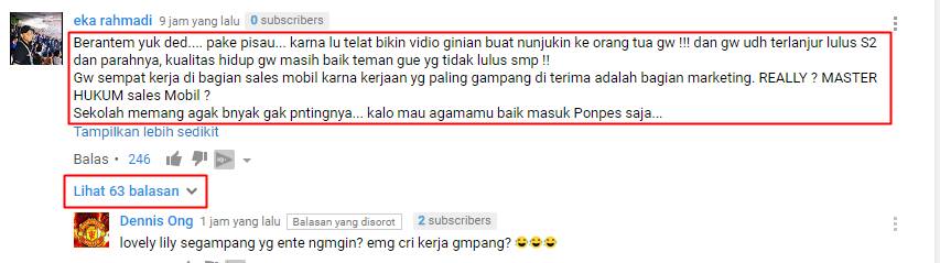 Komentar dari akun bernama eka rahmadi ini mendapatkan banyak balasan dari para youtuber dengan jumlah balasan komentar hingga 63 balasan. Lihat gambar di bawah untuk lebih jelasnya.