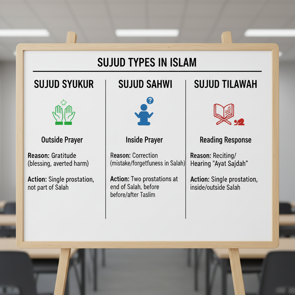 Ketiga jenis sujud yang akan kita pelajari (Syukur, Sahwi, dan Tilawah) adalah bentuk pengagungan yang menunjukkan bahwa manusia adalah makhluk yang penuh syukur, rawan lupa (lalai), dan tunduk pada keagungan Al-Qur’an.